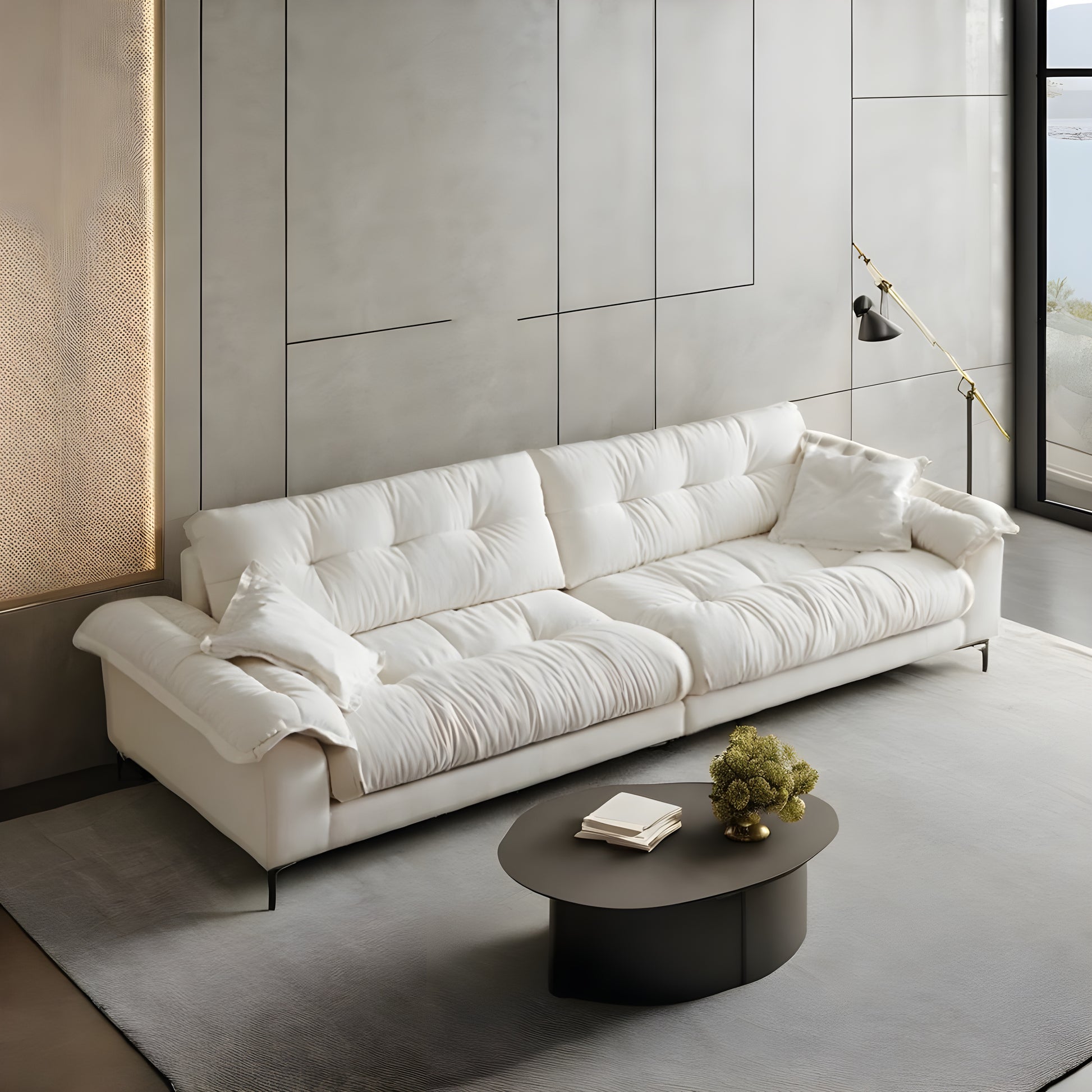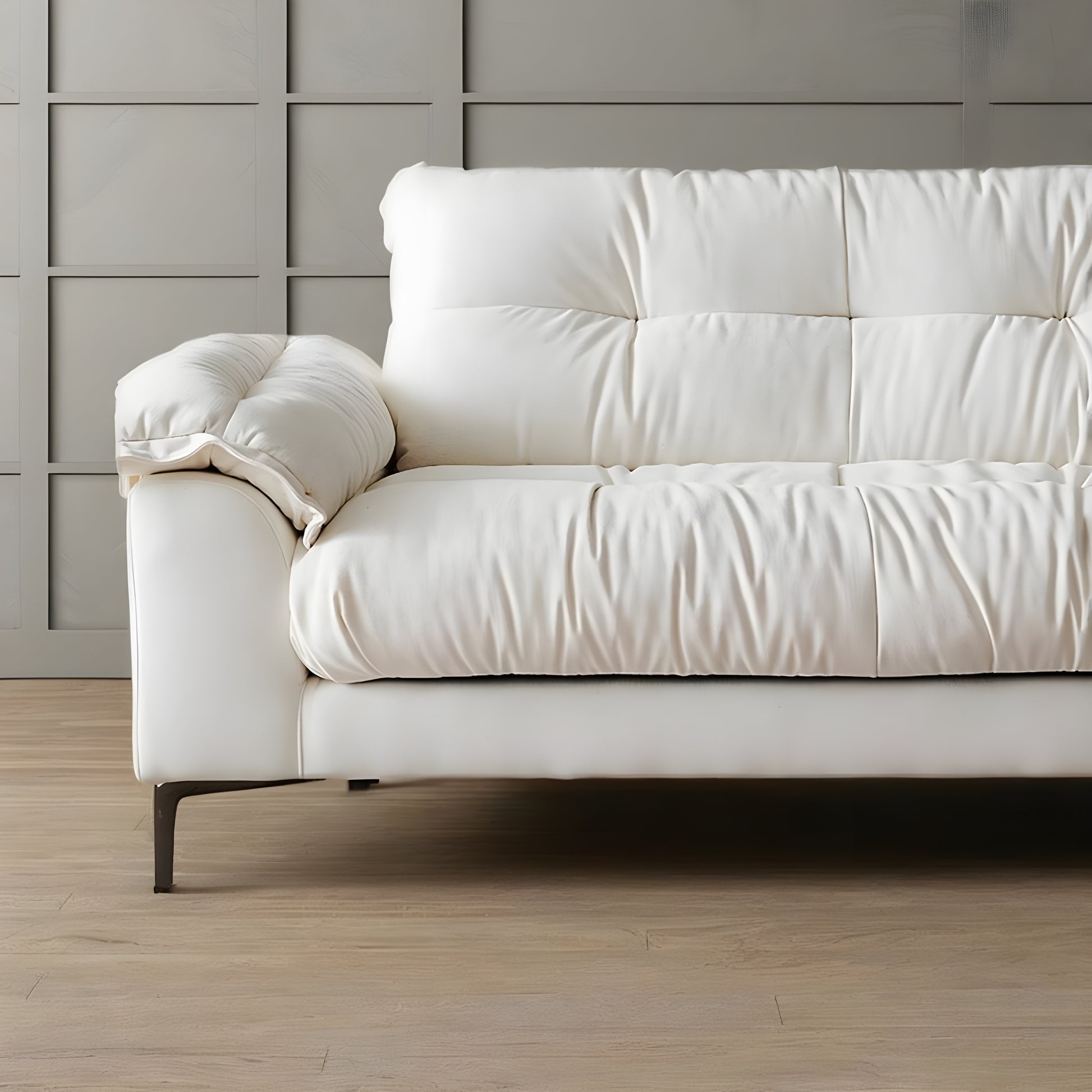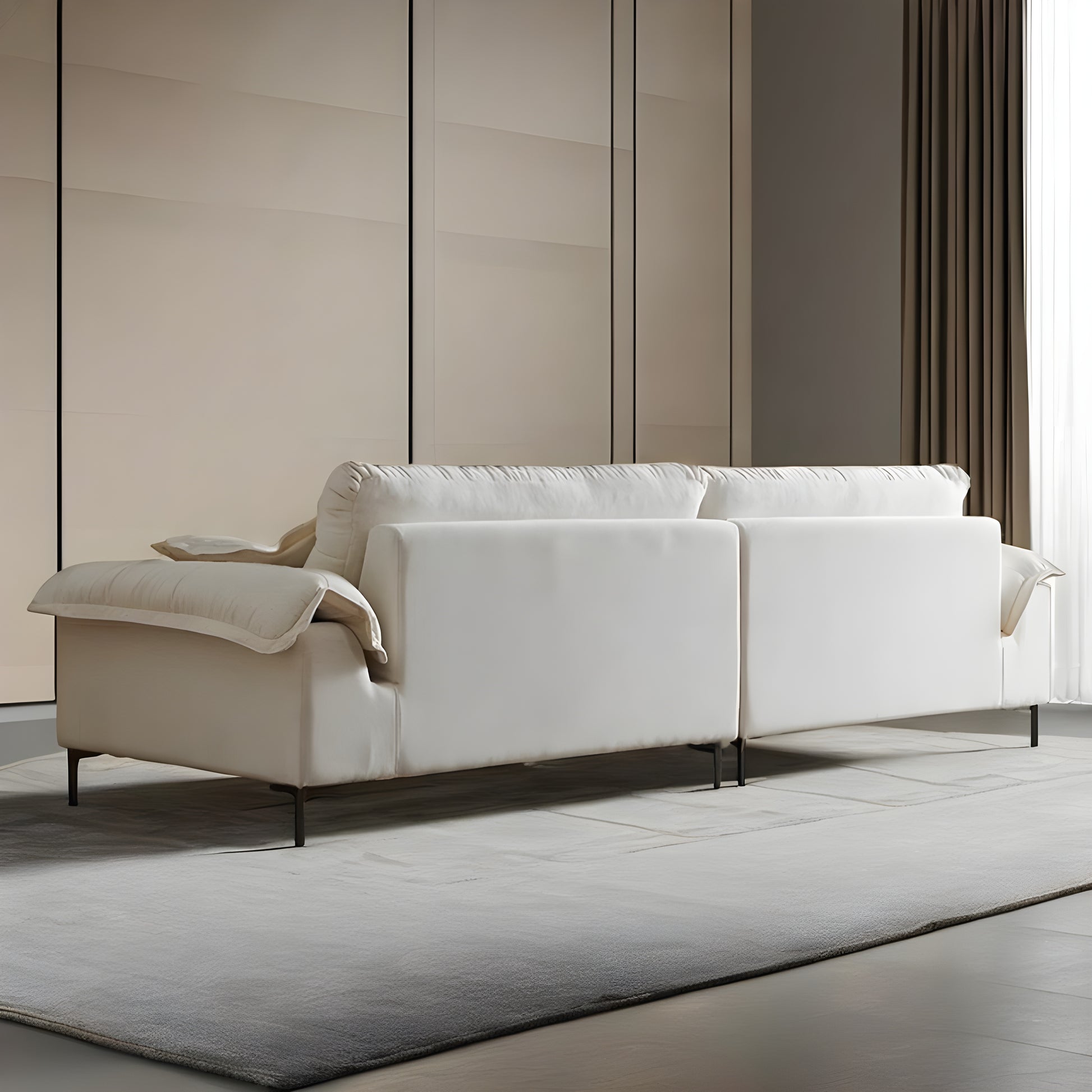 Material: Wooden sofa frame, high density foam and feather, chenille covering, metal legs