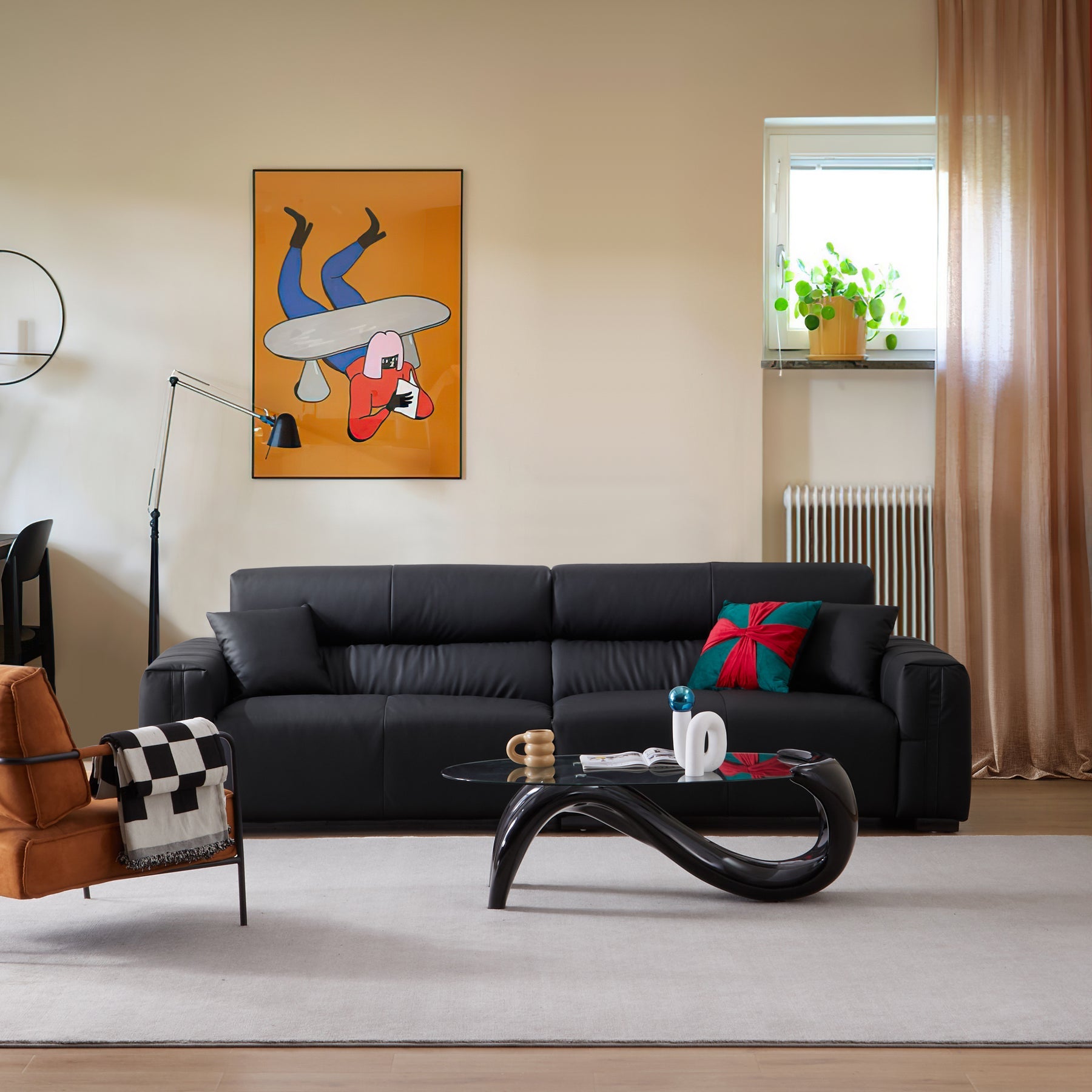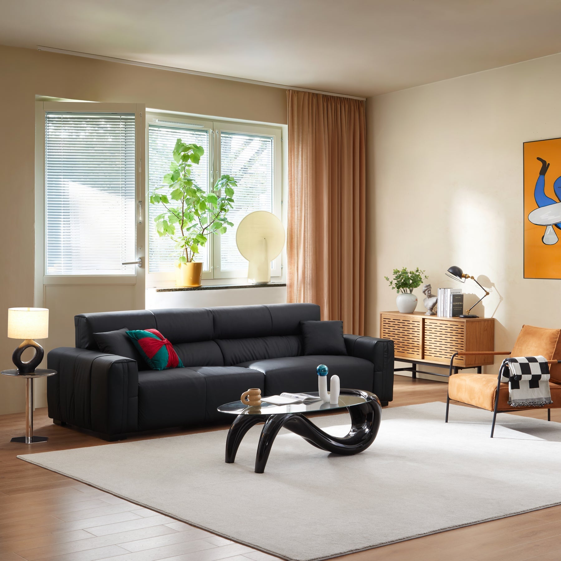 3 seater black genuine leather modular sofa